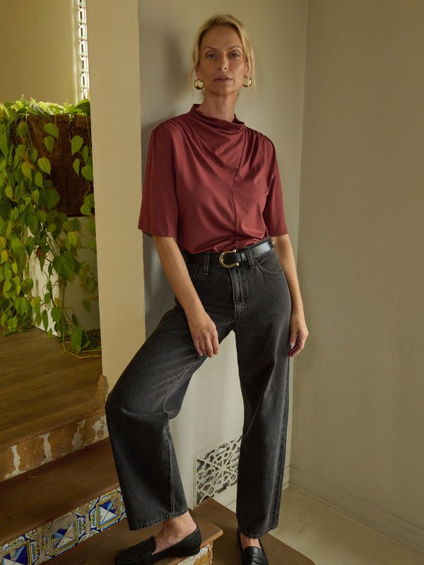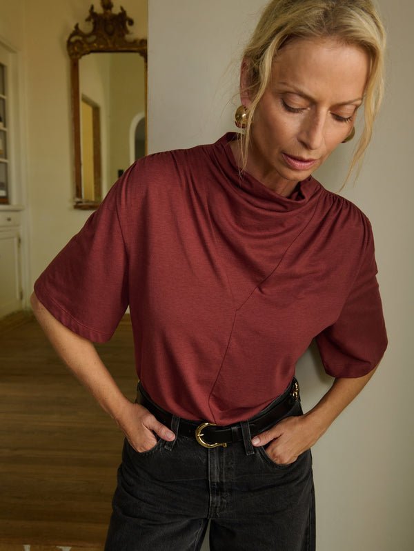 Easygoing, but definitely thought about. The Lara Tee delivers that perfect in-between energy—like your oversized, vintage tee met with a subtle, sculptural twist. It's crafted from a luxe jersey in our classic signature fit, with a V shaped neck seam that creates delicately draping and feminine shirring at the shoulder.