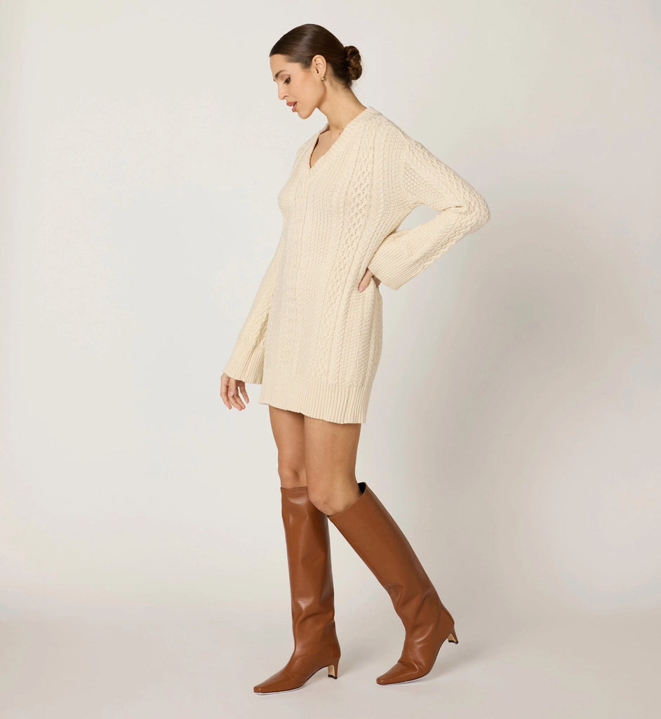 Ethically handmade in India from 100% organic cotton, the Amira Mini Dress is a sustainable wardrobe essential. This slip-on V-neck mini sweater dress features rib-knit detailing at the neckline, hem, and cuffs for a refined finish. Perfect for everyday wear or effortless layering, the Amira combines comfort, craftsmanship, and conscious design in one timeless silhouette.