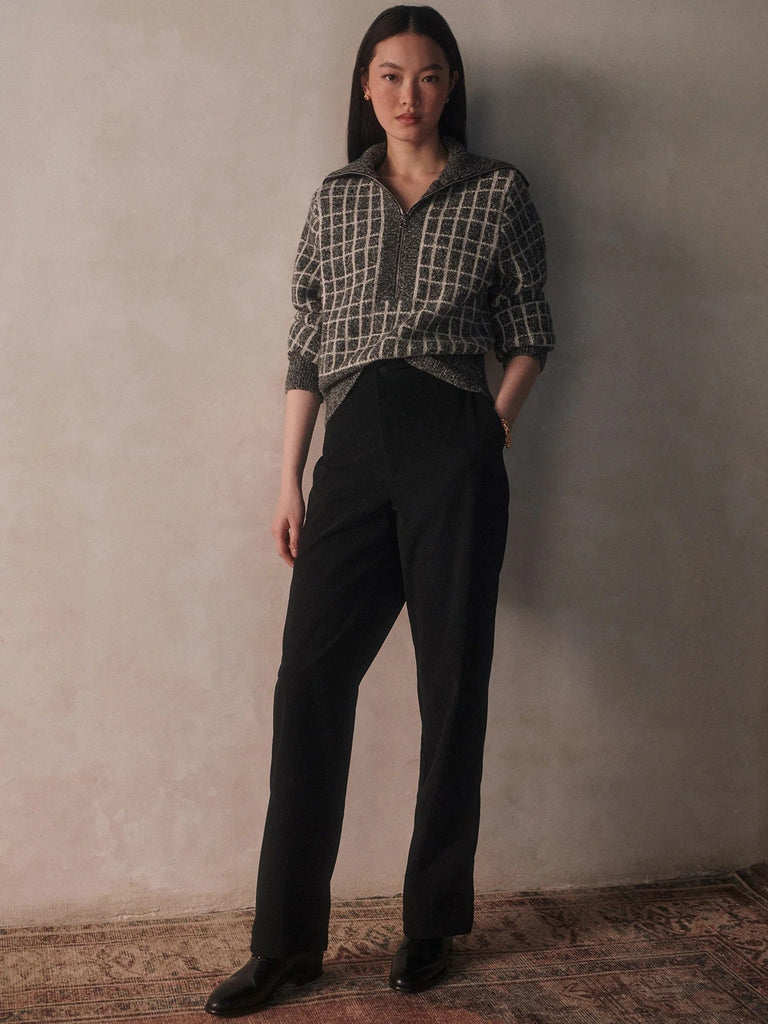 Set a statement with the Furley. A classic half-zip sweat with a turn-back collar, the Furley is an easy throw-on knit, made for elegant layering. Crafted from a Plush Bouclé Jacquard in a checkered pattern, it offers a soft texture, perfect to wrap up in.