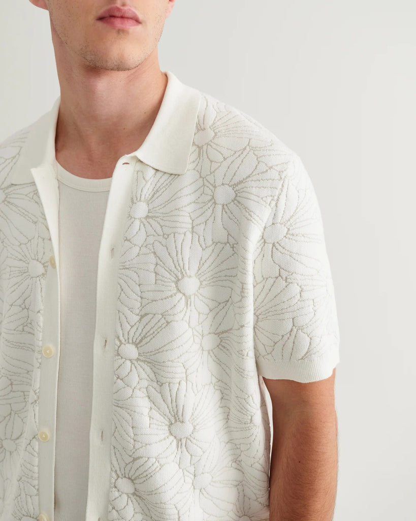The Tellaro knitted short-sleeve shirt returns, reworked in a cotton floral jacquard knit. Woven in an ecru and natural colourway, the subtle tonal pattern adds understated texture and depth, finished with classic ribbed trims for a clean, refined shape.