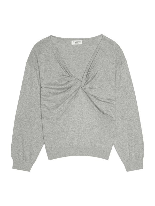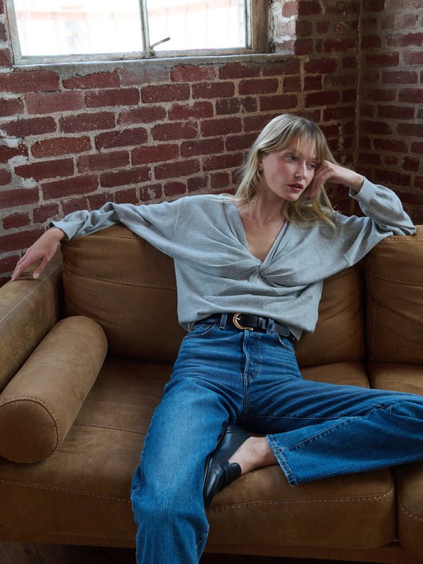This cashmere cotton blend is a true cozy staple in every collection. Features include a drop shoulder, ribbing at the sleeves and waist for structure, and a gathered, knotted neckline.