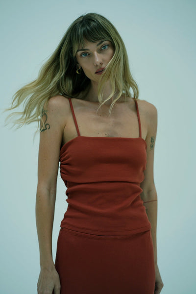 The Lanai is a 2x1 ribbed tank with a straight neckline, double layered top, and side ruching.