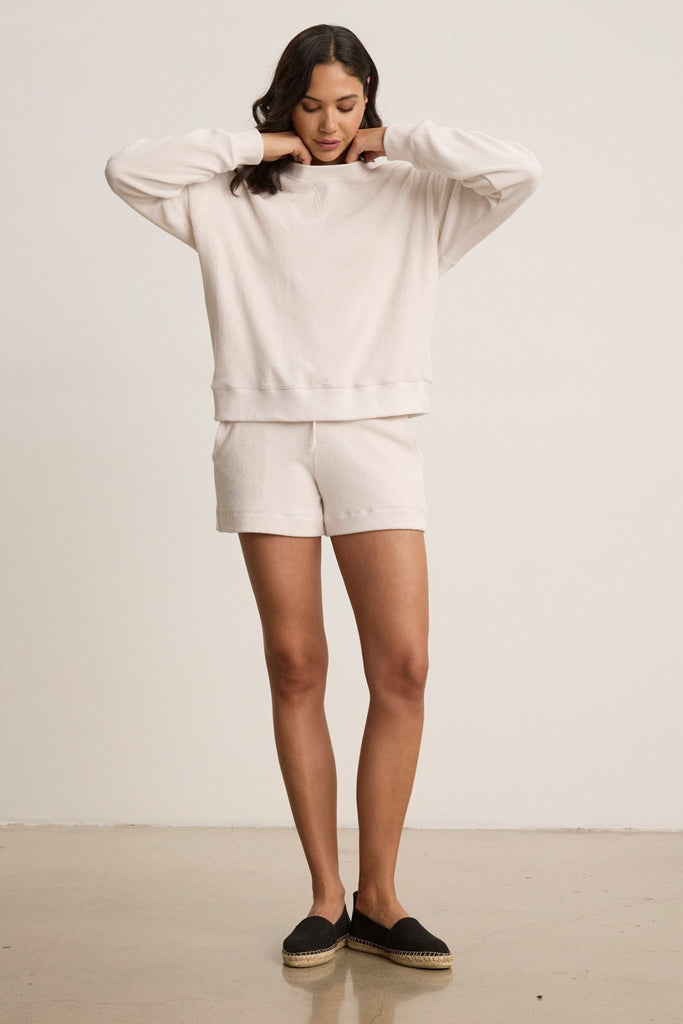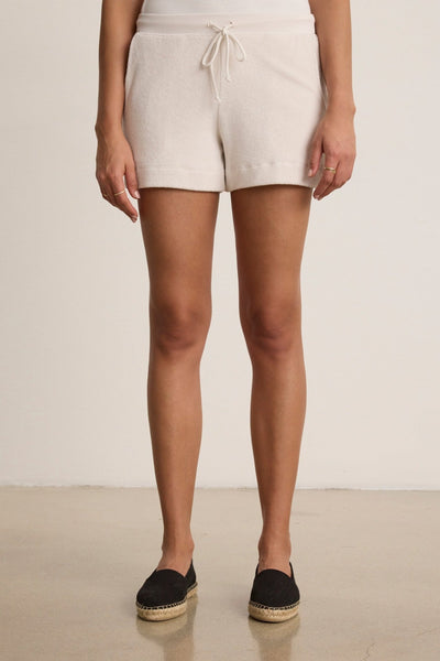 Crafted from soft cotton loop terry for a comfortable, retro-inspired look, these shorts feature slash pockets and an elastic drawstring waist. Offering a relaxed fit, they're perfect for casual days by the pool or lounging.